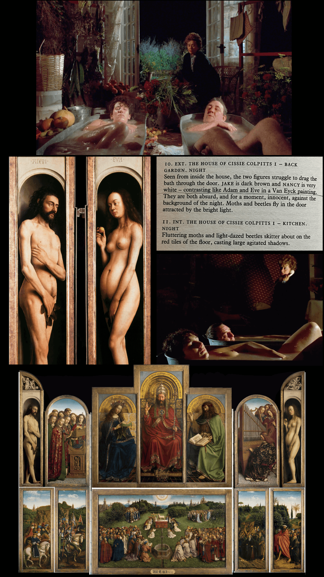 Greenaway: “That’s a sort of game-playing thing, but also a sort of heritage thing—there’s that very beautiful phrase by John Donne: “No man is an island” —no film is an island. Films are constantly, constantly, consciously or unconsciously quoting and repeating this huge heritage we’ve got, both in terms of literature and certainly in terms of painting. So let's do what we can to put as much information in on as many different levels to totally totally engage the audience. I would like to think I make well-wrought films that are capable of being continuously deciphered."