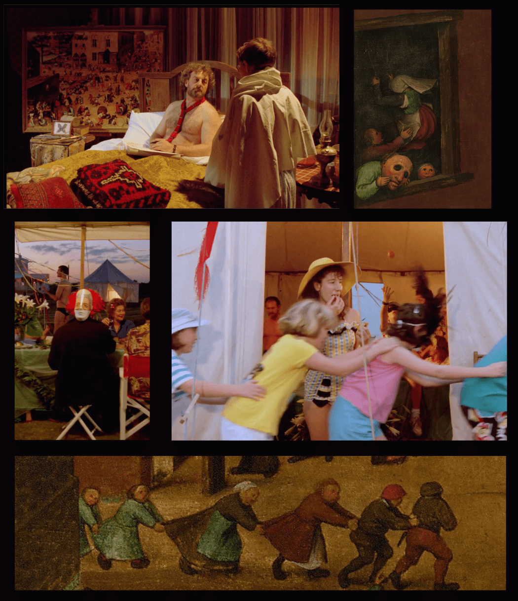 Children's Games by Peter Breughel the Elder might be the most instructive work concerning Greenaway's approach to the film. Staged next to the bed in Madgett's house, the painting blurs the lines between childhood and adulthood by portraying children absorbed in games that mirror adult behaviour—competitive, imitative, and often absurd. In Breughel's image, distinctions between child’s play and adult life are superficial; both are governed by routines, social performance, and a kind of blind absorption in invented rules. Greenaway evokes Breughel in framing, colour palette, and staging, often reproducing scenes from the painting as tableaus in the film.