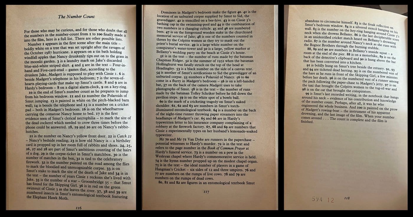 If you're watching this film and want to know where each number goes, the complete number count is listed in the back of the screenplay, which we've excerpted here. Below is the complete list Greenaway wrote out, but it's suggested there are other possible lists.