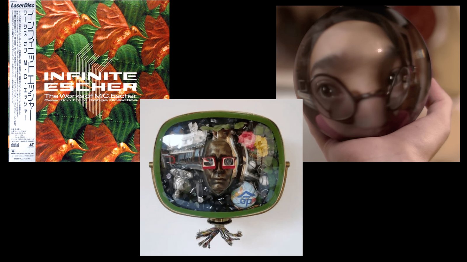 L-R: Soundtrack by Ryuichi Sakamoto (cover art by Floyd Gillis), Nam June Paik, Self Portrait, 1989; Sean Ono-Lennon as ‘The Boy” with Laserdisc’s Bulge effect re: the original by Escher