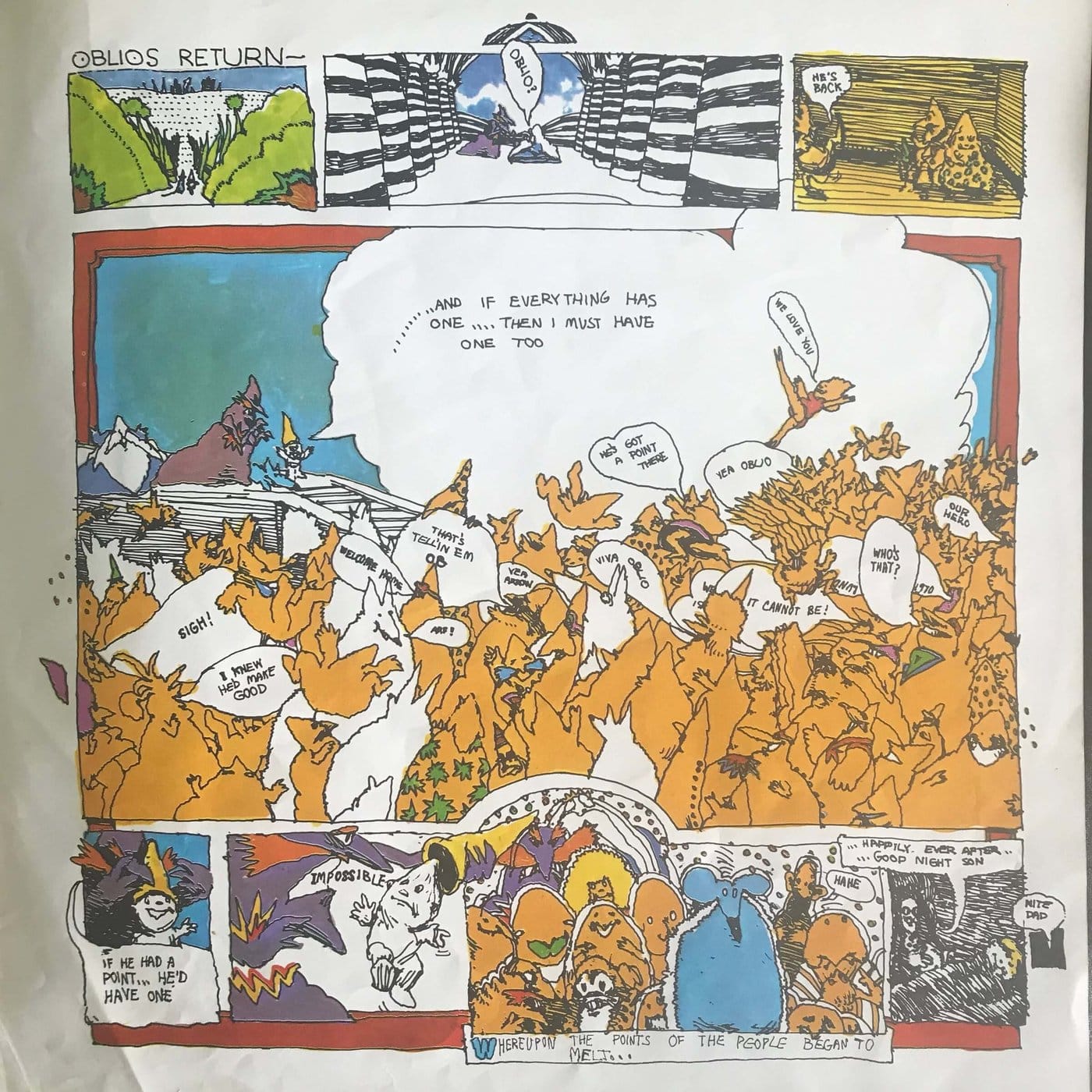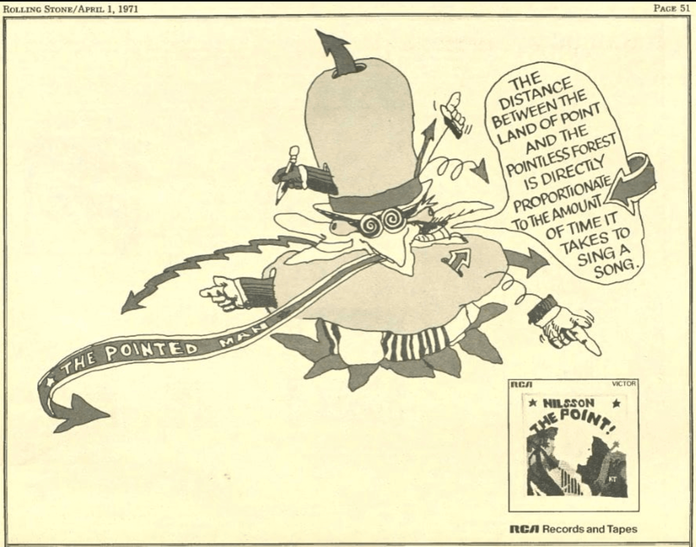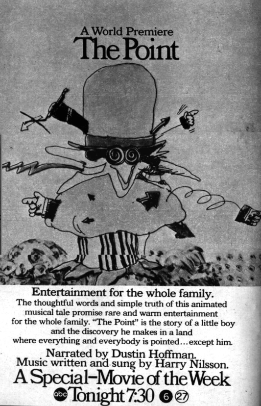 The Point is a psychedelic fable written and composed by Harry Nilsson. The story follows the journey of a round-headed boy, Oblio and his faithful dog, Arrow who live in the Land of Point. Oblio is born with somewhat of a deformity: he doesn't have a 'point' like the rest of the townspeople. Because of this, he and Arrow are exiled to The Pointless Forest. The story is laden with a stoned mysticism interspersed with sunny, playful music, all written by Harry Nilsson. A hallmark of 1970's music and media culture, it was conceived as a threefold multimedia project: a concept album, an illustrated storybook, and an animated TV special. Nilsson himself pitched The Point directly to ABC’s top executives, ensuring network support for “the first film of its kind” on television. And it was!
